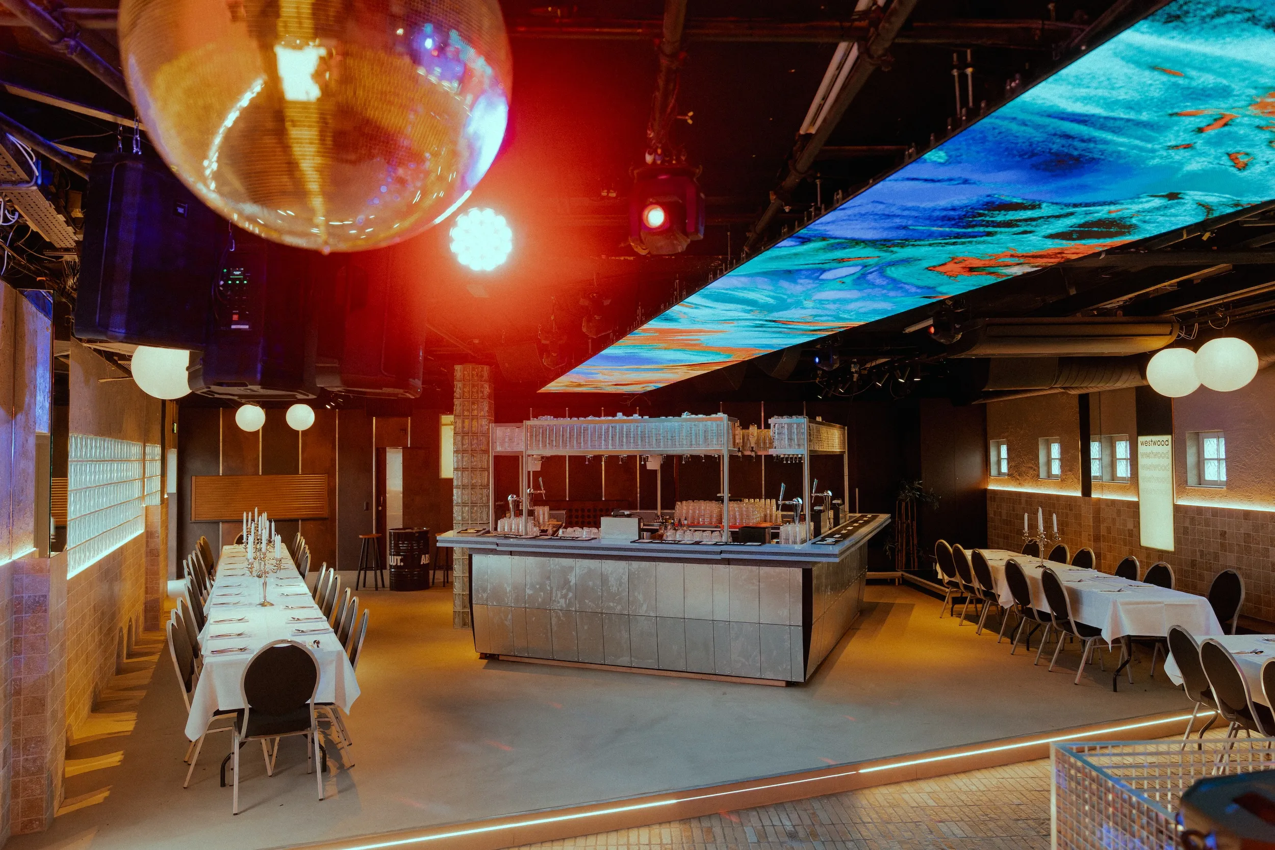 state-of-the-art licht- en geluidsinstallatie,spectaculair LED-plafond, AV/streaming, modulaire DJ boothen podiumdelen